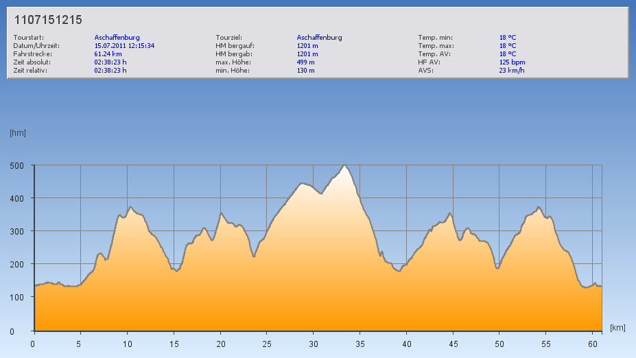 Die führte mich aus Aschaffenburg hinaus nach Steinbach. Weiter hinauf nach Johannesberg. Dann die erste Abfahrt nach Wenighösbach. Die nächsten Orte waren Rottenberg und Eichenberg. In Sommerkahl begann dann der Anstieg zum Engländer. Dieser lies sich prima fahren – einer meiner Lieblingsanstiege. Die Abfahrt nach Sailauf war auch nicht von schlechten Eltern. Allerdings musste ich da auf eventuelle Boen achten. In Sailauf bog ich in Richtung Eichenberg ab. Auch dieser Anstieg auf der einsamen Straße machte sehr viel Spaß. Auf der Höhe traf ich wieder auf die Strecke von der ich kam und fuhr auf dem selben Weg zurück. Also Rottenberg, Wenighösbach und Johannesberg. Steinbach ließ ich aus und fuhr auf der Hauptstraße nach Aschaffenburg hinab. Auch dies war ein tolle Abfahrt, mit Panoramablick über Aschaffenburg. Aber auch hier muss man auf Windboen achten. Heute besonders, und so erreicht ich keinen Topspeed und musste teilweise sogar pedalieren, um nicht unter die 50 km/h-Marke zu fallen. Durch Aschaffenburg fuhr zurück und war rechtzeitig im Studio.