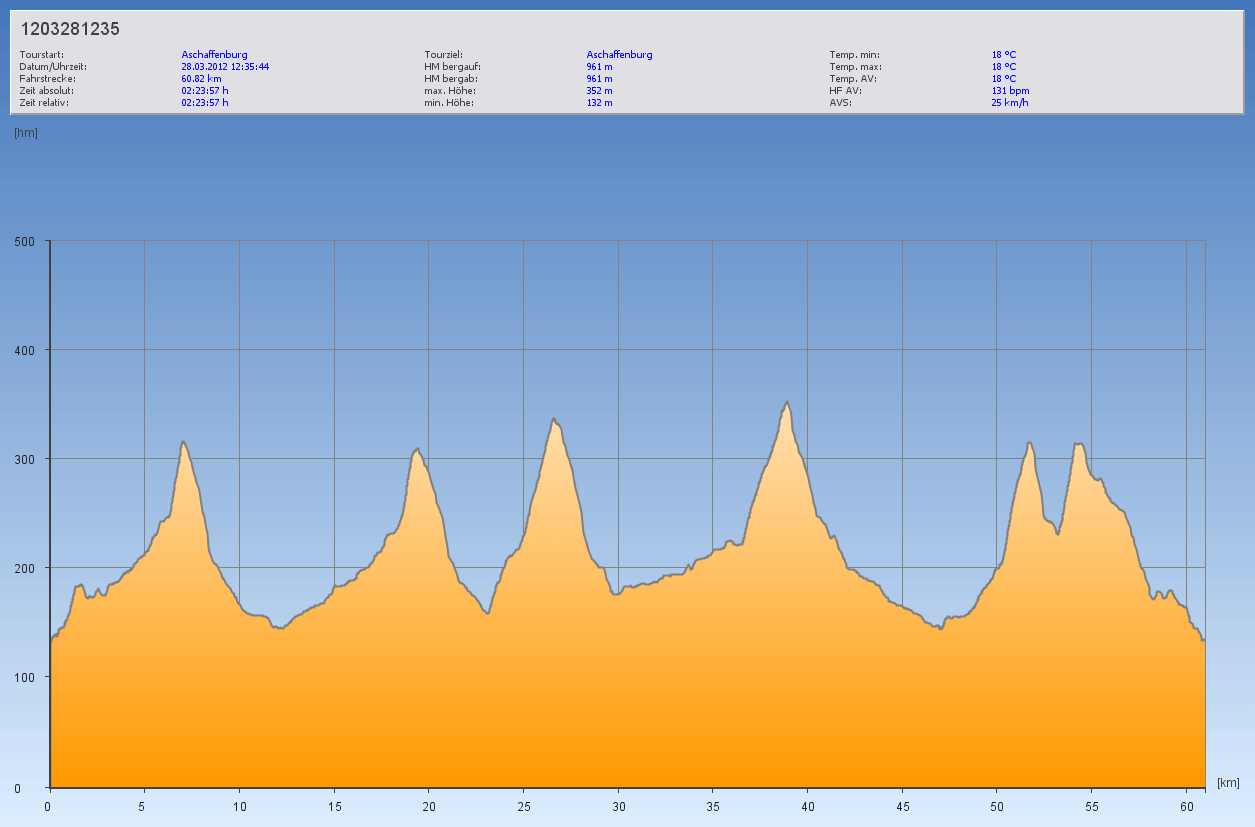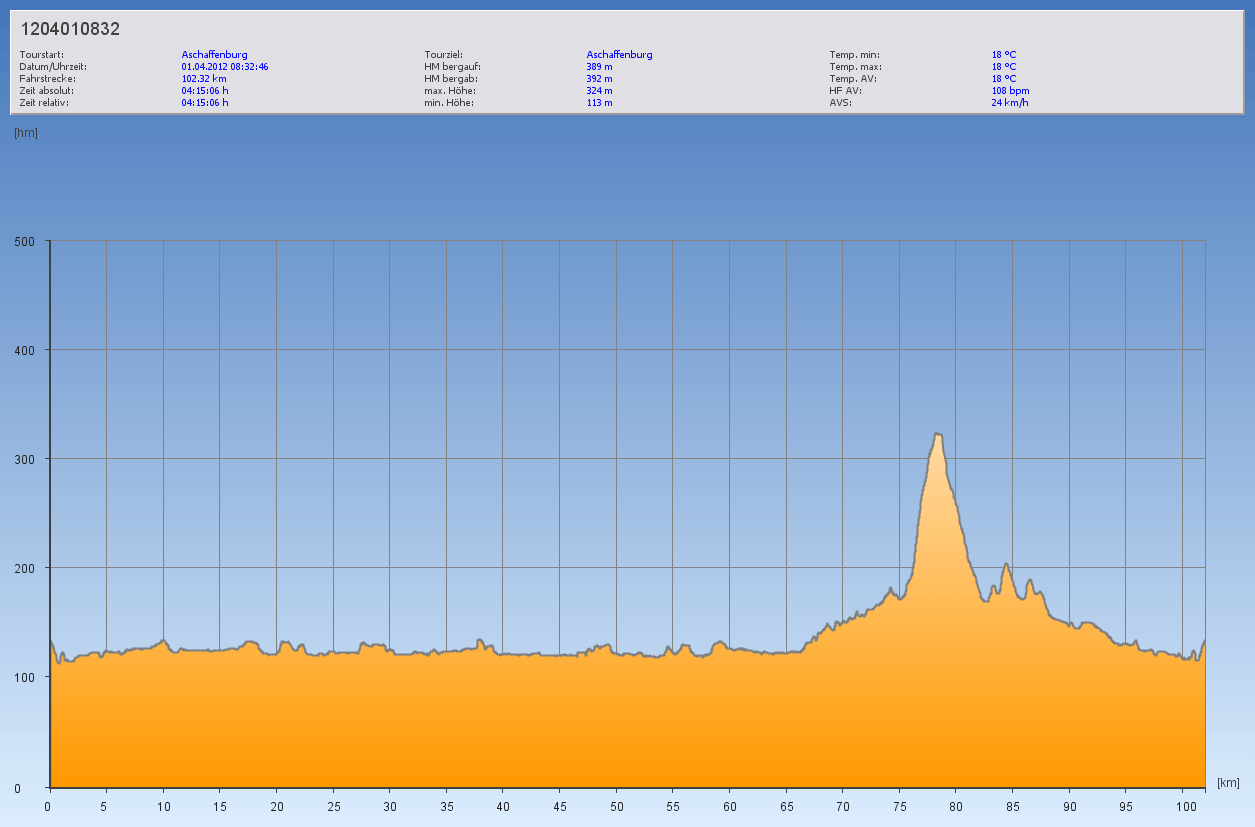 Ich fuhr zunächst mit einem alten Schulfreund nach Großheubach und begleitete ihn dann bis Wenigumstadt nach Hause. Da ich noch Zeit hatte, beschloss ich nach 70 Kilometern den 100er voll zu machen. So fuhr ich weiter nach Mosbach und Radheim, überquerte den Binselberg und fand mich in einer Gegend wieder, in der ich bis jetzt noch nicht war. Zumindest nicht mit dem Rad. Die Stationen meiner Heimfahrt lauteten dann: Klein-Umstadt, Kleestadt, Schlierbach, Schaafheim. Ringheim lies ich links liegen und ab Großostheim war ich wieder auf bekanntem Terrain unterwegs.