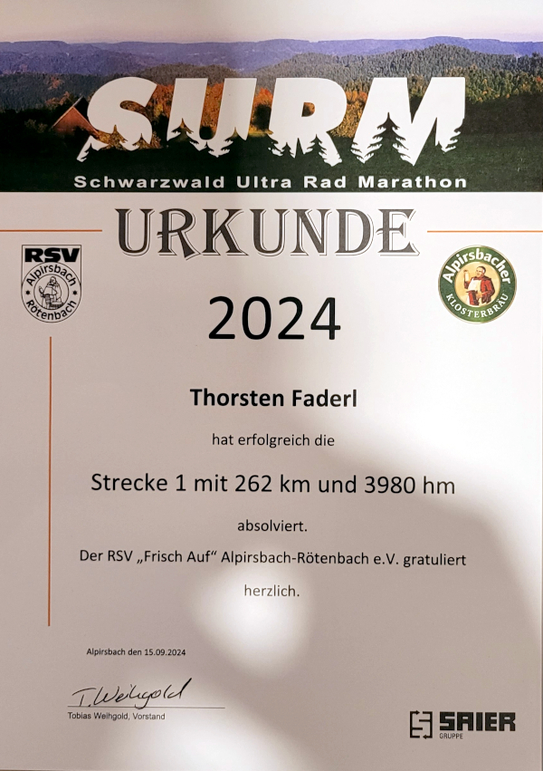 Fazit: Wenigstens einen Radmarathon 2024 erfolgreich absolviert. Der SURM ist eine tolle Veranstaltung und ich finde, eine Teilnahme lohnt sich – insbesondere wenn das Glottertal wieder aus der Streckenführung gestrichen ist.