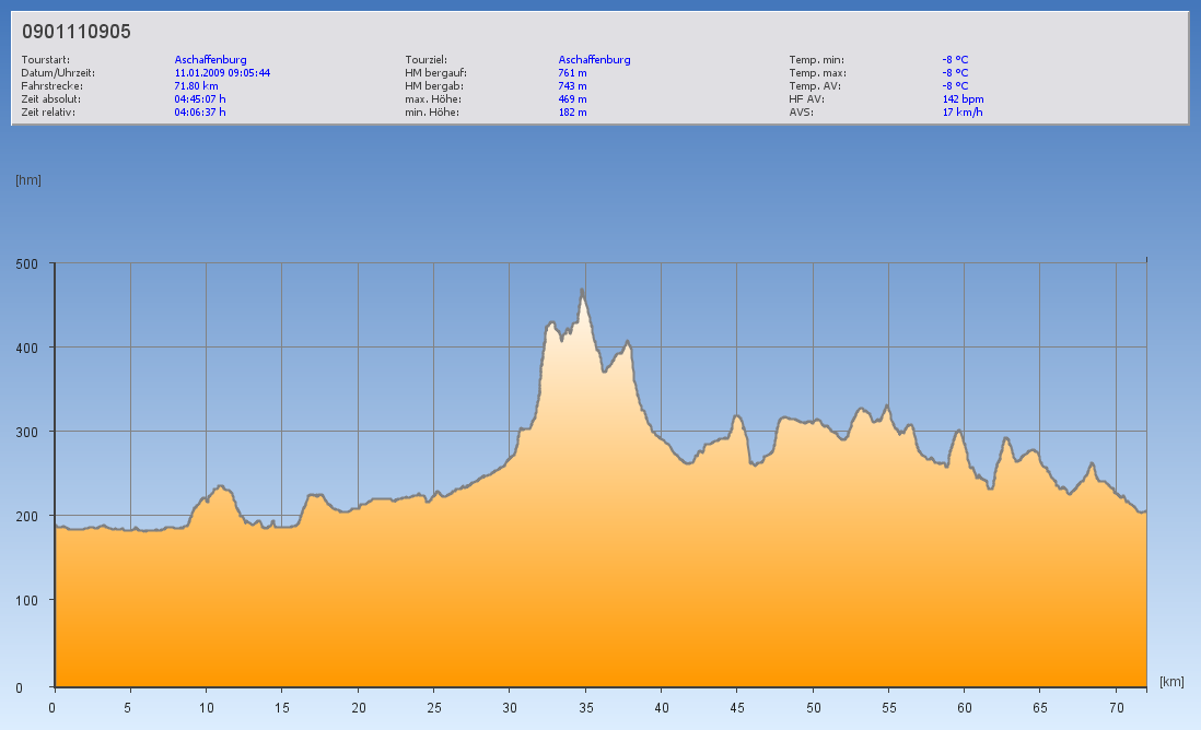 Björn, der oben auf mich gewartet hatte, fuhr weiter, während ich noch kurz pausieren musste. Hannes, der übrigens auf einem Crossrad(!) fuhr, war auch schon weg. Ab hier war ich also auf mich alleine gestellt. Ich holte meinen MP3-Player raus und rockte los. Die Abfahrt vom Schwanberg war aufgrund des Schnees nicht einfach, verlief aber ohne Sturz. Der Schwanberg war der einzige nennenswerte Berg auf der gesamten Strecke.