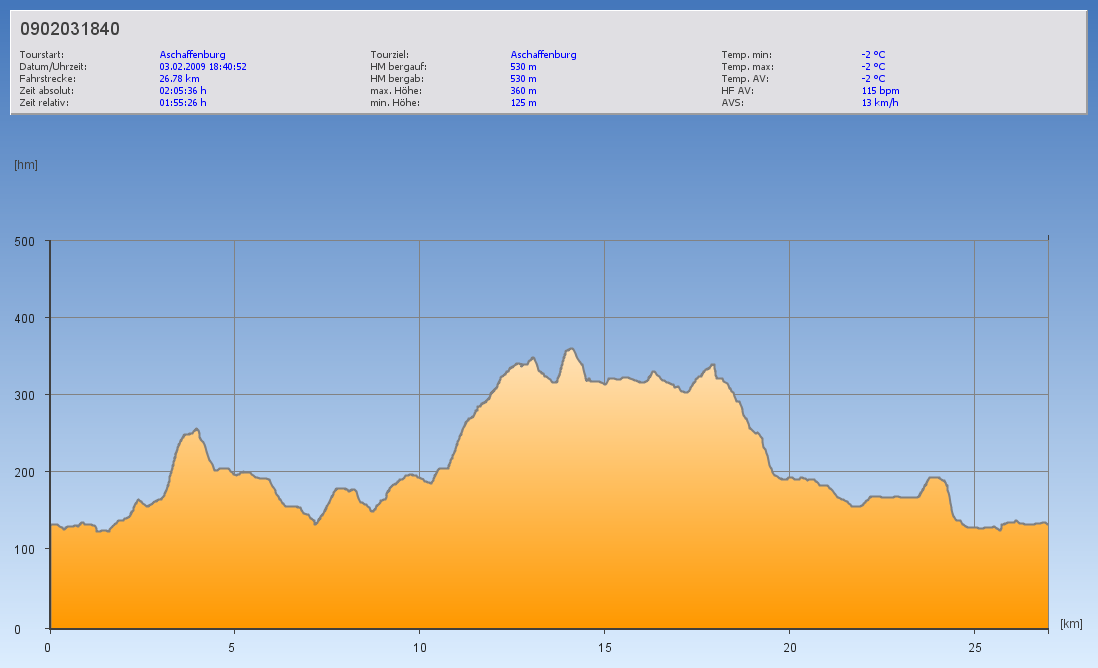 die Daten kommen von meiner Polar S725X und werden per Infrarotschnittstelle vom PC ausgelesen. Die Höhenprofile hier kommen aber von der Auswertung mit dem Programm „BikeXperience“