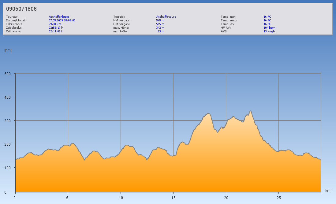 Feierabendrunde Veröffentlicht am 7.5.2009 von Thorsten Faderl Heute fuhren wir einen Teil der Sulzbacher CC-Strecke ab. Hier die Daten: Fahrzeit: 02:11:05 Kilometer: 29,08 km Durch. Geschw.: 13,31 km/h Max. Geschw.: 41,04 km/h Höhenmeter: 545 m Rad: Stevens Glide ES Und das Höhenprofil: Keep on biking!