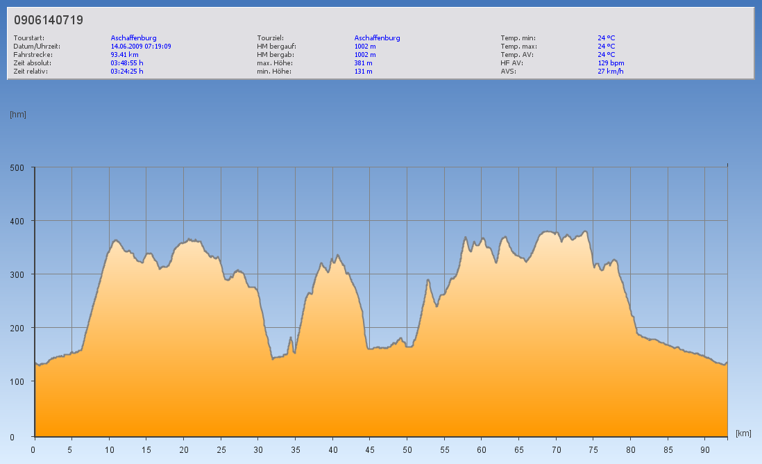Am frühen Samstag, um 7.00 Uhr stand ich mit einigen Vereinskollegen am Start in Bürgstadt. Es war noch wenig los, und die Anmeldung ging schnell. Kurz darauf saßen wir auf dem Rad und fuhren los. Schon am ersten Anstieg zeigte sich sehr deutlich, dass wir mit der Spitzengruppe aus unserem Verein nicht mithalten konnten. Nach 25 Kilometern zog ein weiterer Fahrer unserer 4er Gruppe ab. Zu dritt bestritten wir nun die restliche Strecke.