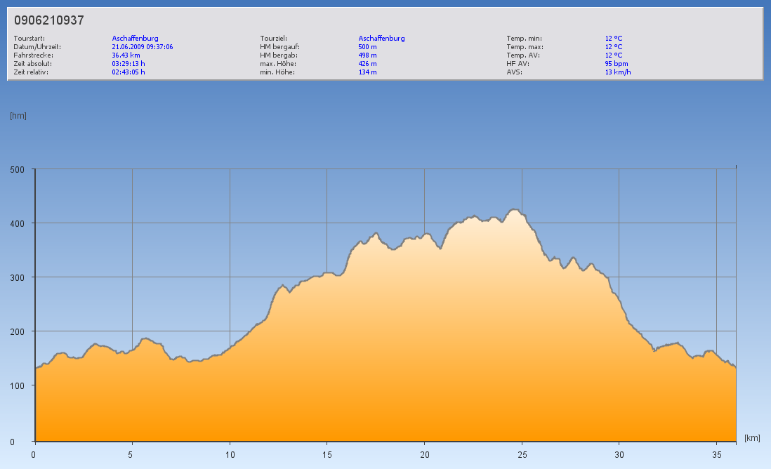 Aschaffenburg – Exe (off. Start) – Leidersbach – Schöntal – Rossbacher Sportplatz – Volkersbrunn – Hohe Warte – Frühstückseiche – Exe (off. Ende) – Aschaffenburg