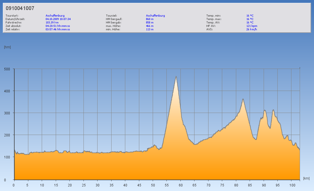 Von Mönchberg ging es weiter durch Eschau, Sommerau, Hobbach. Hier bogen wir links ab und fuhren im Elsavatal bis Hessenthal hinauf. Auf der B8 fuhren wir nach Straßbessenbach. Wir nahmen noch den Anstieg nach Dörrmorsbach mit, rollten nach Gailbach hinunter um noch den Anstieg nach Grünmorsbach bezwingen zu können. In Haibach trennten sich unsere Wege. Ich fuhr dann am „Exe“ vorbei nach Schweinheim und von hier nach Hause.