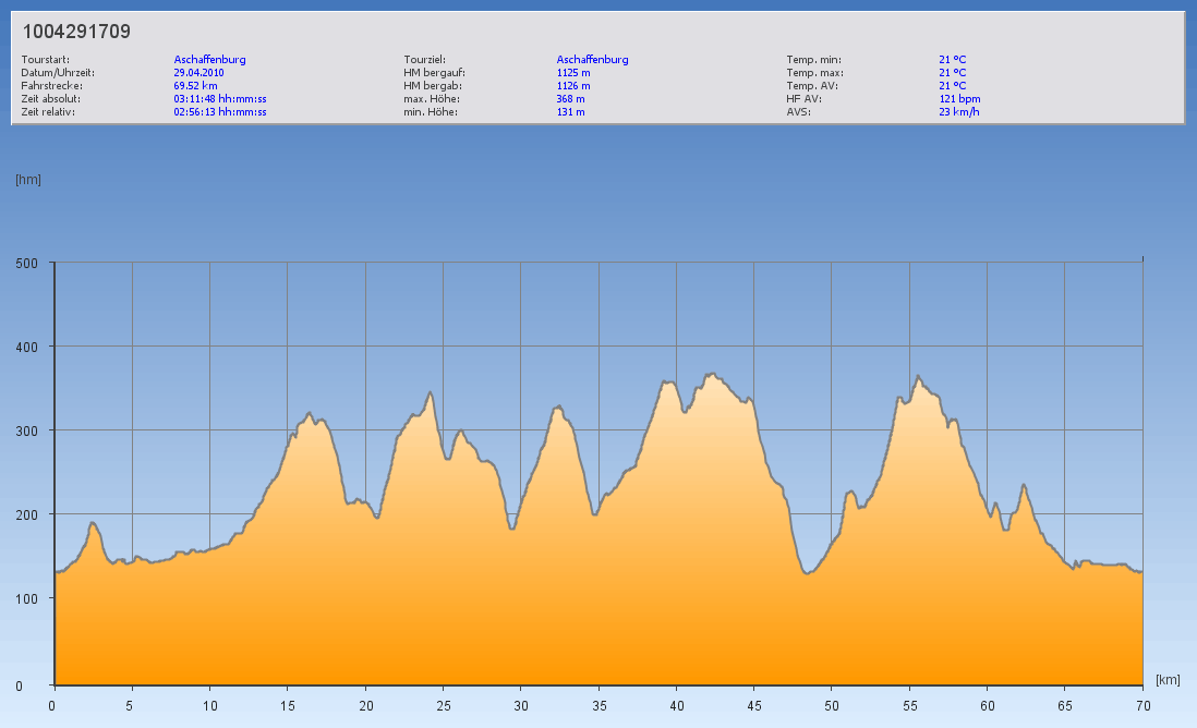 Aschaffenburg – Goldbach – Hösbach – Sailauf – Eichenberg – Sommerkahl – Blankenbach – Eichenberg – Rottenberg – Wenighösbach – Breunsberg – Daxberg – Hohl – Rückersbach – Johannesberg – Aschaffenburg – Steinbach – Johannesberg – Breunsberg – Unterafferbach – Goldbach – Aschaffenburg