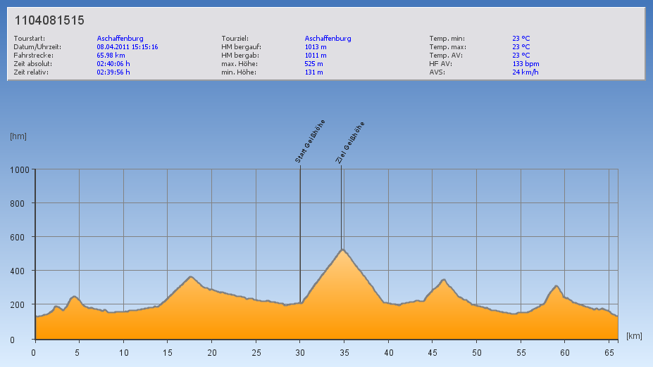 Auf der heutigen Feierabenrunde kam es zum ersten Formtest in diesem Jahr. Zusammen mit Zenon eröffnete ich die Zeitfahrserie „Sturm auf die Geißhöhe“ 2011. Meine Bestzeit lag letztes Jahr bei 00:16:58. Mit keinen großen Erwartungen ging ich an den Start. Mein Ziel war dranbleiben. Und unter 20 Minuten bleiben. Das war letztes Jahr ungefähr die Zeit beim ersten Zeitfahren. Zenon machte gleich viel Tempo, ich blieb dran, konnte ihn auf den letzten Metern gerade noch überholen und fuhr tatsächlich meine persönliche Bestzeit. Und das im April.