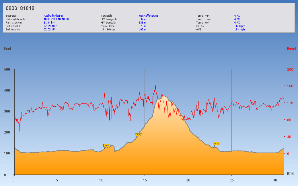 Heute Abend fuhren wir mal wieder durch die Rückersbacherschlucht. Das ist immer wieder eine nette Trainingsrunde. Besonders der letzte Anstieg vor Rückersbach ging an die Substanz. Hierbei erreiche ich auch immer die höchsten Pulswerte auf der Tour.