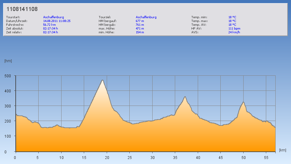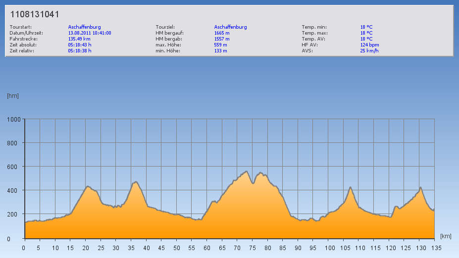 Am Sonntag spürte ich nichts mehr von den Schmezen und fuhr deswegen mit dem Rad nach Hause. Zunächst lief es prima. Am Main radelte ich bis Collenberg und überquerte dann, da bis hierher immer noch schmerzfrei, den „Col du Col“. Doch bei diesem Anstieg begann es schon wieder zu zwicken. Ich wollte mir meine Schwäche aber nicht eingestehen und fuhr weiter über Heimbuchenthal, Volkersbrunn, Soden und Gailbach. Naja, mit Voltaren ging es irgendwie. Wie ich allerdings in zwei Wochen 240 Kilometer und 5.500 Höhenmeter überstehen soll, ist mir im Moment noch ein Rätsel…