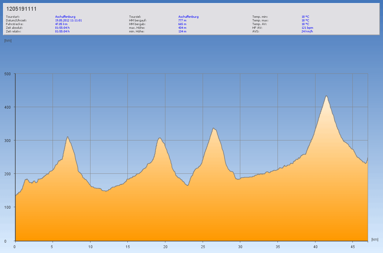 Den Vatertag nutzten wir für einen schönen Familientag. Darum holte ich meinen Vatertag am Freitag nach und unternahm eine ausgedehnte Radtour. Eigentlich wollte ich ganz früh los und die Strecke von der „Spessarträuber extrem“-Tour abfahren. Doch ein Blick aus dem Fenster machte meine Hoffnung auf einen schönen Tag mit dem Rennrad zunächst zunichte. Es regnete. Frustriert setzte ich mich an den Rechner und surfte bei gpsies.com vorbei. Ich wollte nach ein paar neuen Strecken Ausschau halten. Dabei stolperte ich über die Touren-Sammlung von User Jambo.