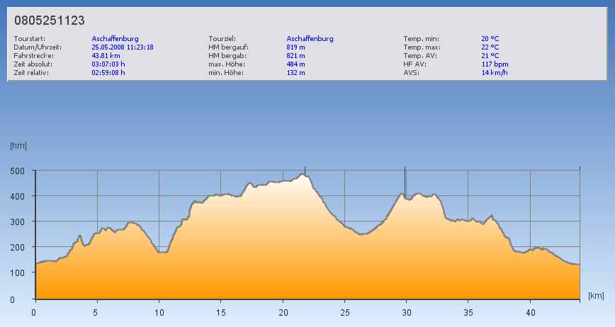 Zurück zur heutigen Tour. Mit Dierk und Matthias wollte ich heute zum Echterspfahl fahren. Wir starteten in Aschaffenburg. Durch die Fasanerie und über die Kippenburg fuhren wir nach Grünmorsbach. Dann verlief die Strecke hinab nach Straßbessenbach. An den Steinbrüchen vorbei, kämpften wir uns hinauf zum Posthalterkreuz. Auf der Höhe erreichten wir dann den Echterspfahl. Wir überlegten kurz, ob wir einkehren sollten, entschieden uns aber in Anbetracht der noch verbleibenden Strecke dagegen. Nun folgte eine rasante Abfahrt durch den Ingelheimer Grund zum Wasserschloss Mespelbrunn. Aber wo es runter geht, geht es auch wieder rauf