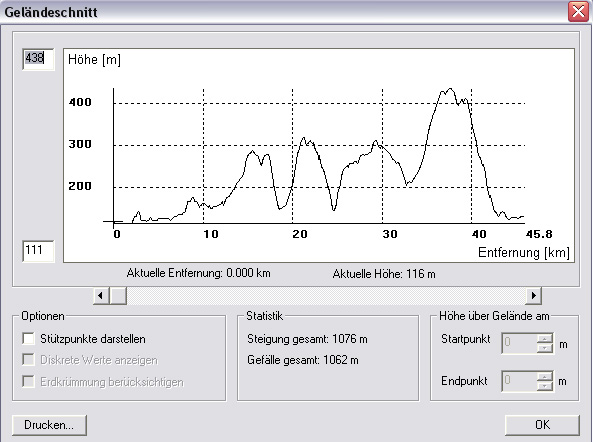 Laut Geländeschnitt sollte die Strecke knapp 46 km lang sein und das Höhenprofil ca. 1100 Höhenmeter aufweisen.